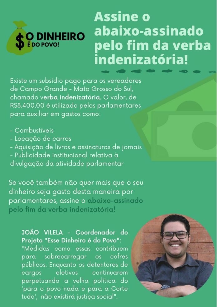 Indignados com os privilégios recebidos por parlamentares, membros do projeto “Conexão Diversidade” lançaram uma petição pública pelo fim da verba indenizatória de R$8.400, recebida por vereadores de Campo Grande. A quantia é paga mensalmente, mediante apresentação de notas comprobatórias, para sanar gastos de mandato dos parlamentares, como gasolina, aluguel de carros, telefonia, assinatura de livros e revistas, entre outras despesas. De acordo com João Vilela, coordenador da campanha “Esse Dinheiro é do Povo”, não há justificativa para os trabalhadores terem que pagar por um privilégio dos vereadores.