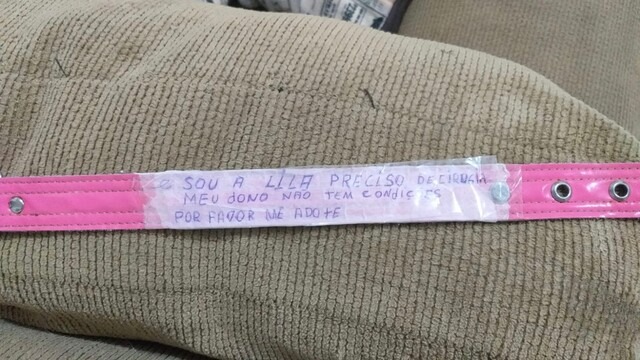 “Sou a Lila, preciso de cirurgia. Meu dono não tem condições. Por favor, me adote!”, era essa a mensagem pregada em um pedaço de papel na coleira da cachorra, que é da raça bulldog francês. Um técnico encontrou o animal sozinho e abandonado na Rua do Vale, no bairro Tiradentes, e o recolheu.