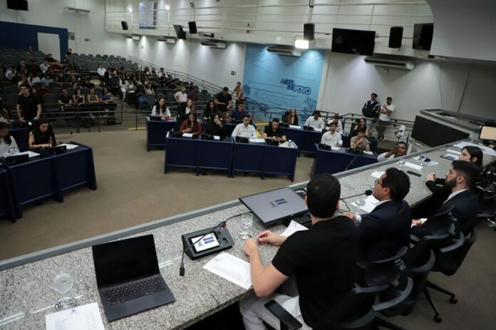Acadêmicos de quatro turmas de Direito da UCDB (Universidade Católica Dom Bosco) participaram de uma Sessão Simulada na Câmara Municipal de Campo Grande. O objetivo foi vivenciar, na prática, como funciona o Legislativo Municipal. Eles elegeram os vereadores, a Mesa Diretora, definiram partidos e lideranças. A iniciativa foi do vereador Jean Ferreira, em parceria com a instituição, e ocorreu na manhã desta quarta-feira, dia 22, no Plenário Oliva Enciso da Casa de Leis.