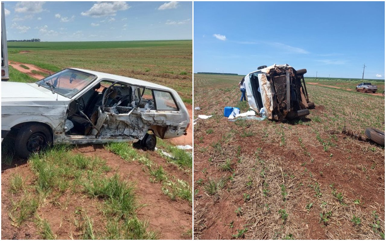 Devido a força da colisão, o Fiat Doblô acabou capotando e parou de lado, às margens da rodovia. Já a Belina teve a roda traseira arrancada.