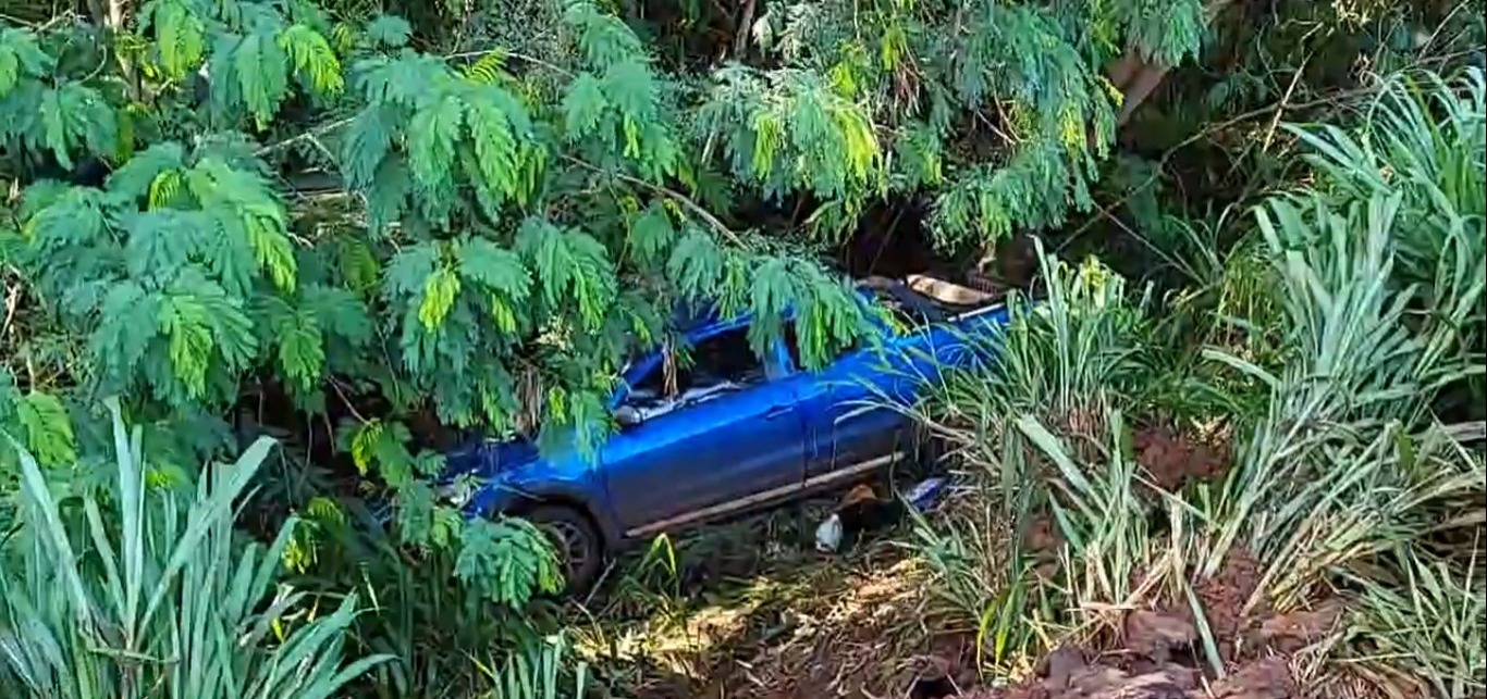 Após bater na Saveiro, o caminhão acabou atingindo a traseira de uma caminhonete Hilux. Com a força da batida, a picape capotou e caiu em um barranco nas margens da estrada.