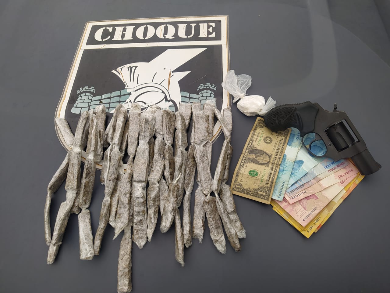 No endereço informado pelo autor, foi localizado um revólver calibre .38 e porções de cocaína e maconha, embaladas com papel filme, prontas para comercialização. Foram apreendidos cerca de 80 papelotes.