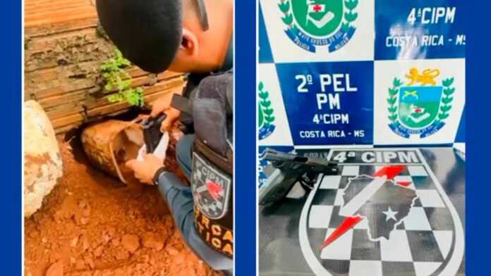 Um adolescente de 16 anos foi apreendido após a Polícia Militar localizar uma arma de fogo enterrada no quintal da residência onde ele mora, na Rua Adeor Correia Leite, em Costa Rica, a 344 quilômetros de Campo Grande. A apreensão ocorreu durante ação das equipes da 4ª CIPM, com apoio da Inteligência da PM e de informações repassadas pela Polícia Civil.