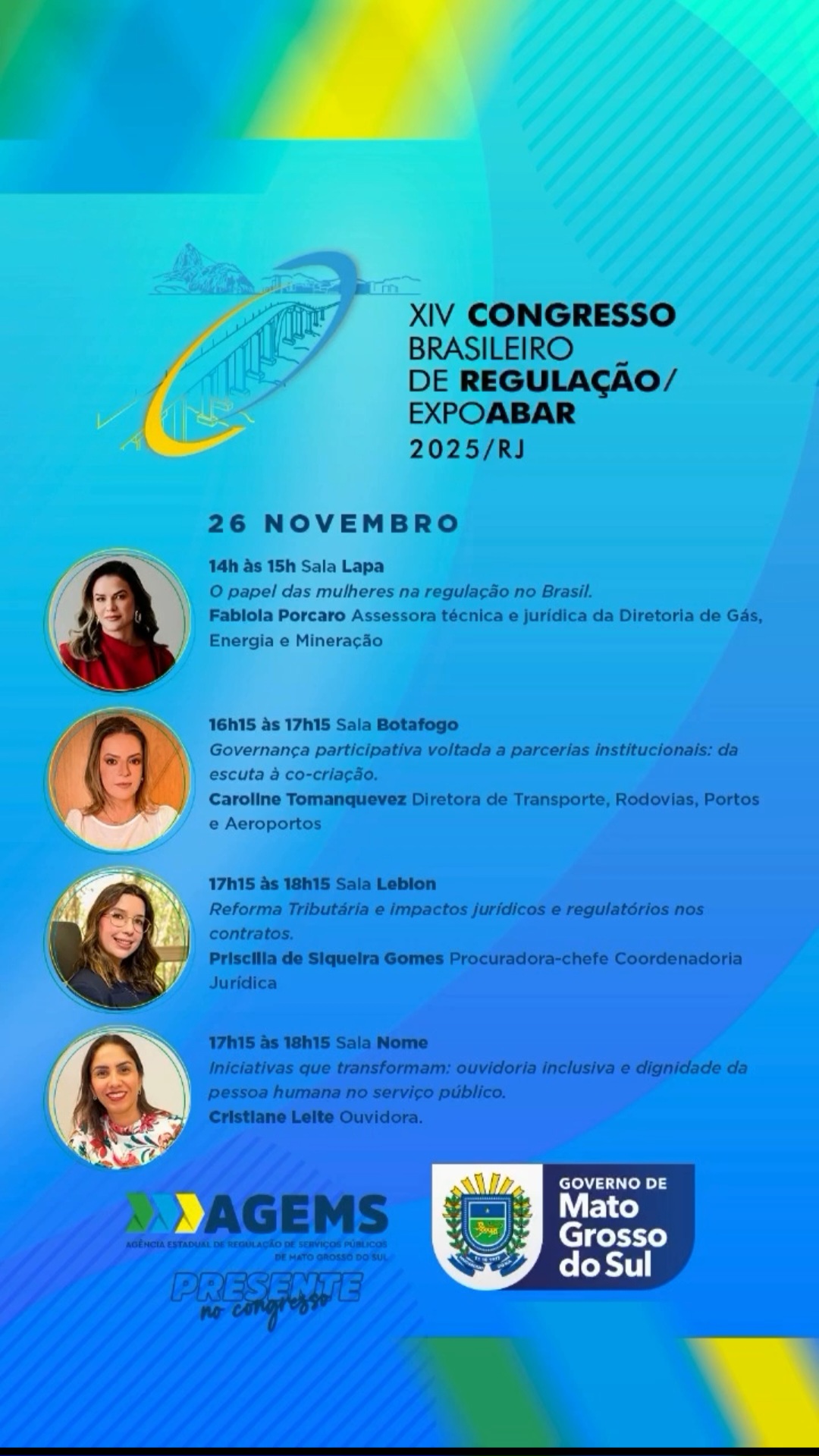 O protagonismo feminino da AGEMS também estará presente em diferentes frentes. A assessora técnica e jurídica Fabiola Porcaro participa da discussão sobre o papel das mulheres na regulação, enquanto a diretora Caroline Tomanquevez leva a experiência de Mato Grosso do Sul para o debate sobre governança participativa e engajamento dos usuários nos serviços de transporte público.