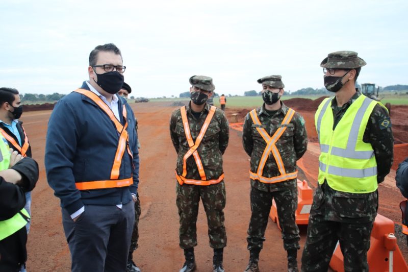 O prefeito de Dourados, Alan Guedes, visitou na manhã desta quarta-feira (16) a obra de revitalização do Aeroporto Municipal Francisco de Matos Pereira Acompanhado dos vereadores Laudir Munaretto, Daniella Hall, Jânio Miguel e Daniel Júnior, e do secretário de governo, Henrique Sartori. O grupo conversou com o comandante do 9º Batalhão de Engenharia de Construção, Marton Daniel Grala, que explicou as etapas do trabalho que vem acontecendo no local.