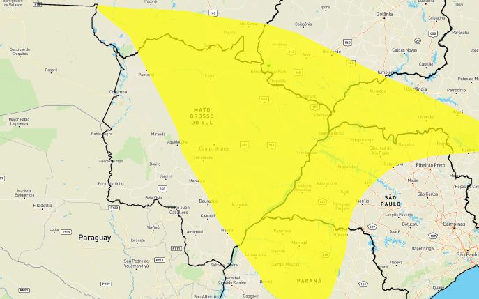 Estão sob alerta as cidades de Água Clara, Alcinópolis, Anastácio, Anaurilândia, Angélica, Aparecida do Taboado, Aquidauana, Bandeirantes, Bataguassu, Batayporã, Brasilândia, Caarapó, Camapuã, Campo Grande, Cassilândia, Chapadão do Sul, Chapadão do Sul, Chapadão do Sul, Costa Rica, Coxim, Deodápolis, Dois Irmãos do Buriti, Douradina e Dourados.