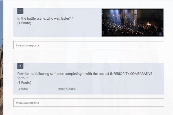 O objetivo era que os alunos praticassem a habilidade de compreensão auditiva ao identificar as falas e os acontecimentos da cena, assim como a aplicabilidade do tópico trabalhado. Fazendo uso do Microsoft Forms, eles fizeram a atividade buscando aplicar na prática o conteúdo dos comparativos na Língua Inglesa.