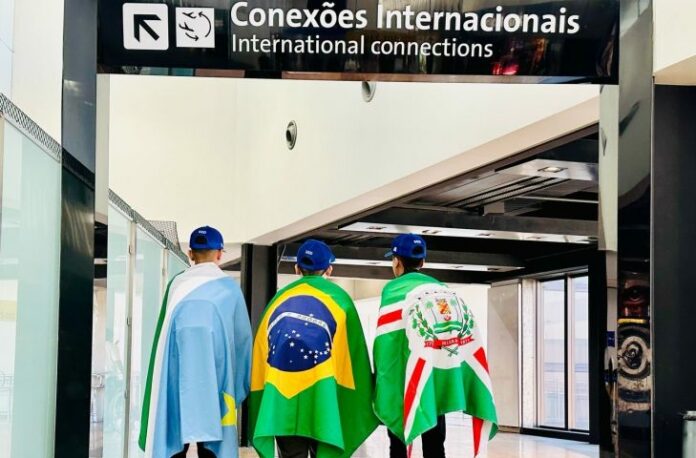 Estudantes com as bandeiras de MS, Brasil e Miranda nas costas, embarcando para a Tailândia (Fotos: Arquivo Pessoal)