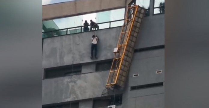 Uma cena de tirar o fôlego pôde ser vista durante a manhã desta quinta-feira (16) em prédio localizado na Rua Dom Aquino, região central da Capital. Um andaime instalado no último andar de um edifício cedeu em um dos lados deixando dois trabalhadores pendurados.