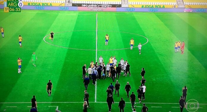 Agentes da Anvisa (Agência Nacional de Vigilância Sanitária) entraram no gramado da Neo Química Arena e interromperam o jogo entre Brasil e Argentina pelas Eliminatórias, logo nos primeiros minutos de início da partida na tarde deste domingo (5). O intuito é impedir que os jogadores que vieram da Inglaterra disputem o confronto de hoje.