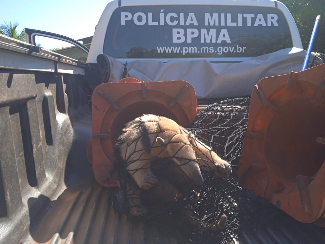 Na manhã de hoje (21), um Tamandua tetradactyla (Tamanduá-mirim) foi capturado pela Polícia Militar Ambiental (PMA) em uma árvore, depois de ser acuado por cachorros, na cidade de Bela Vista.