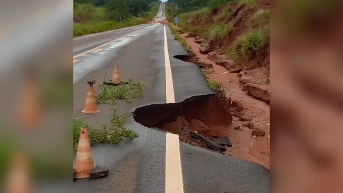 A cratera foi aberta devido as chuvas intensas que tem atingido a região ao longo dos últimos dias. Pelas imagens, é possível ver que houve desmoronamento de terra no barranco ao lado da via.