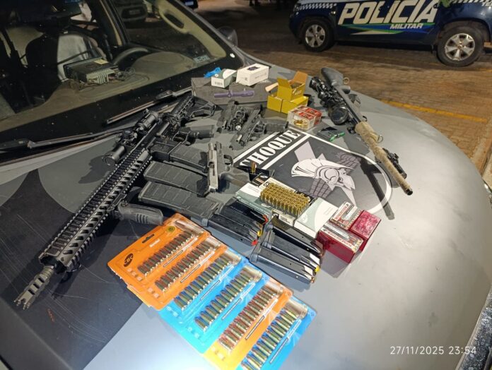 Ao todo, foram apreendidas: 01 pistola calibre .380, com 03 carregadores; 01 pistola calibre 9mm, com 02 carregadores; 01 carabina (fuzil) calibre 5.56, equipada com 01 luneta e carregadores; 01 rifle calibre .17 HMR, com 01 luneta e carregadores; e munições dos calibres 5.56, 9mm, .40, .380 e .17 HMR.