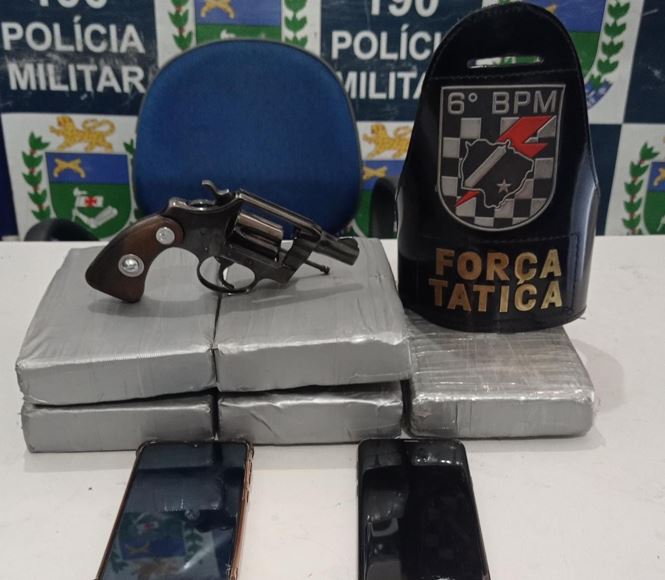 A mulher foi levada para a Polícia Civil pelos crimes de tráfico de drogas e posse irregular de arma de fogo.