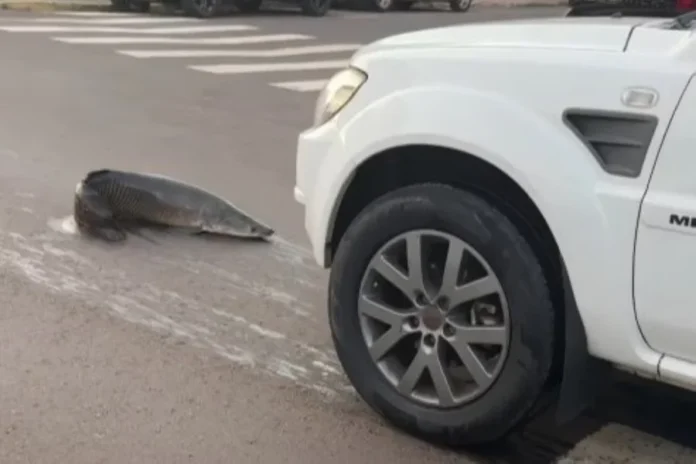O episódio inusitado aconteceu na última quarta-feira (1º), quando o animal era transportado de um pesqueiro até a Feira Central para participar da Festa do Peixe. Durante o trajeto, a pirarucu conseguiu romper a proteção da caixa onde estava e caiu no asfalto, surpreendendo motoristas e pedestres.