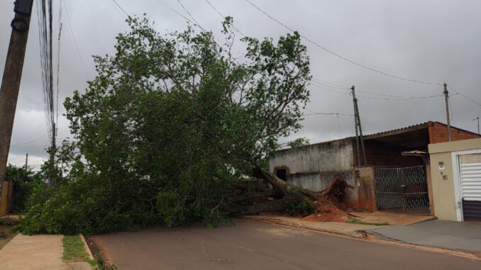 Por conta da força do vento, uma árvore acabou caíndo e interditando o trânsito na Rua Mineira Anache, no trecho entre as ruas Das Codornas e Sebastião Gomes Monteiro, no bairro Nova Lima.
