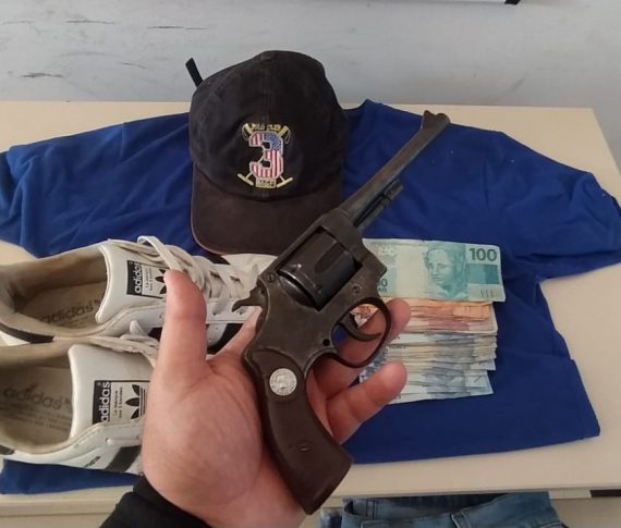 Em vistoria no quarto do autor, foi localizada uma arma de fogo calibre 32, R$ 245 reais e as vestes utilizadas no dia do crime, as quais aparecem nas imagens e diante da comprovação de sua autoria, o acusado foi apresentado na delegacia de polícia juntamente com a arma de fogo e dinheiro oriundo do crime, o qual será devolvido à vítima.