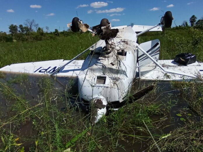 Avião de pequeno porte capota após não conseguir decolar em fazenda de Miranda