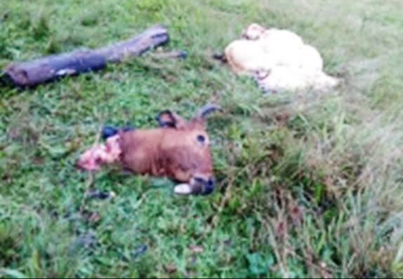 Durante a vistoria com a policia foi constatado que haviam sidos furtados três novilhas, sendo que uma foi morta no local, onde os bandidos deixaram os restos da cabeça e vísceras do animal.