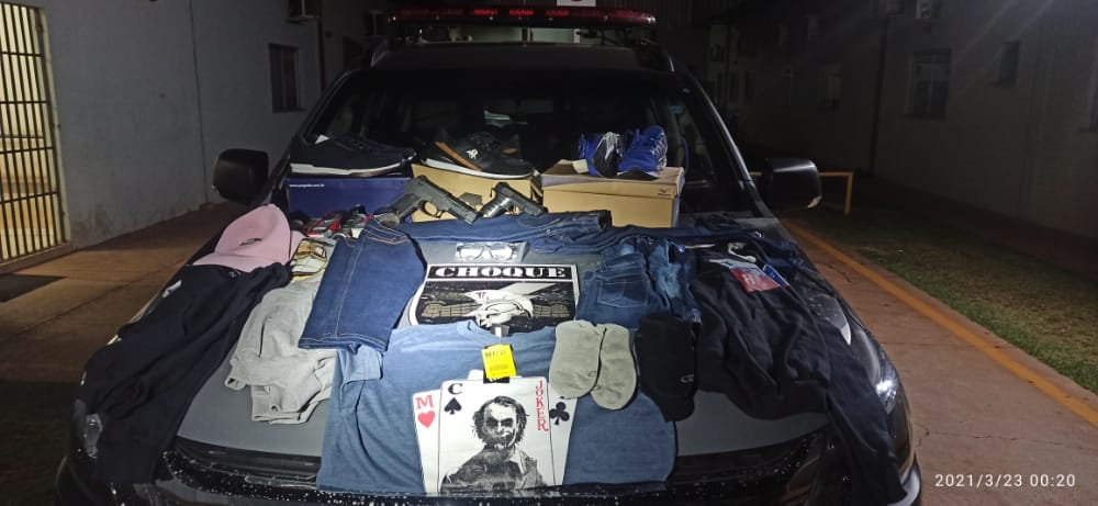 Na casa de Matheus fora encontrado um simulacro de pistola e algumas peças de roupas provenientes do furto ocorrido conforme BO N°549/2021 na data de 14/01/2021 registrado na Depac Centro, na Loja Madona Modas da Avenida Júlio de Castilho. Diante dos fatos os autores foram conduzidos a delegacia.v