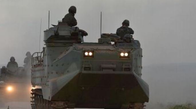 Carros Lagarta Anfíbio realizando manobras durante treinamento (Foto: Marinha do Brasil)