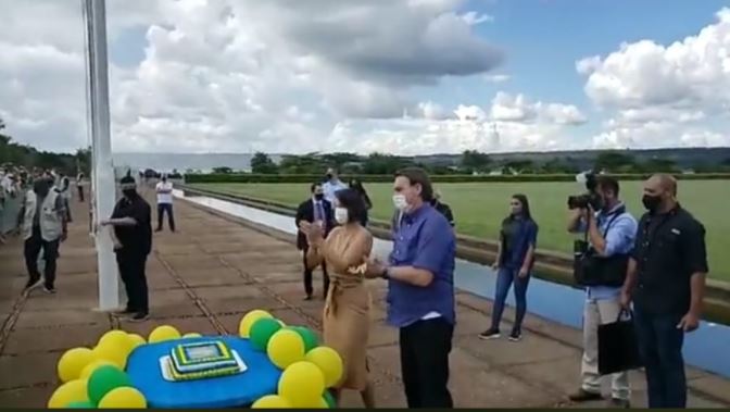 Bolsonaro e Michele chegaram ao ponto de encontro com máscara – ela com um vestido cáqui – e acenaram para os populares. Um alambrado de metal separava o presidente das pessoas. Do lado de dentro, havia um bolo com a foto de Bolsonaro em uma mesa com balões e enfeites nas cores verde e amarela.