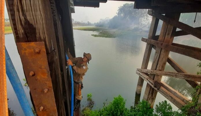 A pronta ação do Corpo de Bombeiros de Corumbá e a participação voluntária de moradores da comunidade do Porto Manga foram decisivas para debelar as chamas e evitar que mais uma ponte de madeira fosse destruída pelo fogo na região da Estrada-Parque (MS-228).