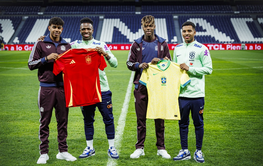 Na véspera do duelo, jogadores do Brasil e da Espanha foram ao estádio do Real Madrid posar para uma foto histórica. Os brasileiros Vinicius Junior e Rodrigo e os espanhóis Nico Williams e Lamine Yamal se encontram no centro do gramado. O presidente da CBF, Ednaldo Rodrigues, e o diretor esportivo da Seleção Espanhola, Albert Luque.