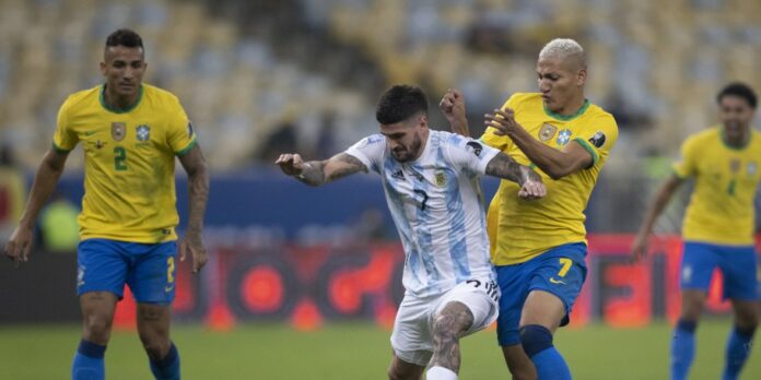 O Brasil enfrentou dura marcação dos argentinos, que protagonizaram diversos lances ríspidos no primeiro tempo. E acabou sendo o rival quem pulou na frente no Maracanã. Aos 21 minutos, Di María foi lançado, saiu cara a cara com Ederson e tocou por cima para abrir o placar. Todavia, a Seleção Canarinho finalizou cinco vezes à meta de Emiliano Martínez, mas sem conseguir converter em gols na etapa inicial.
