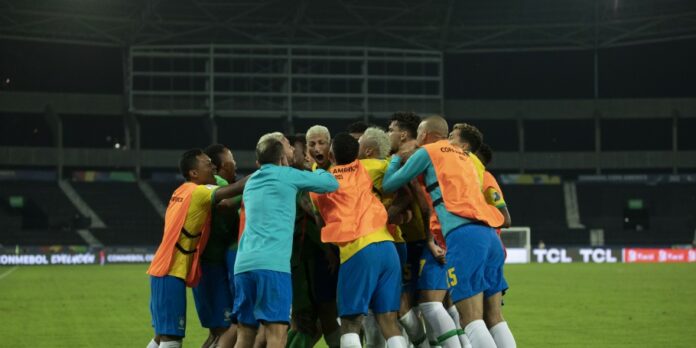 O Brasil começou o duelo tentando impor seu ritmo de jogo, mas viu a Colômbia abrir o placar aos dez minutos, em belo gol de bicicleta de Luis Díaz. Pela primeira vez em desvantagem na Copa América, a Canarinho manteve o controle da posse de bola, mas teve dificuldades para furar a marcação adversária. Quando conseguiu achar os espaços no ataque, a Seleção Brasileira assustou principalmente com Richarlison.