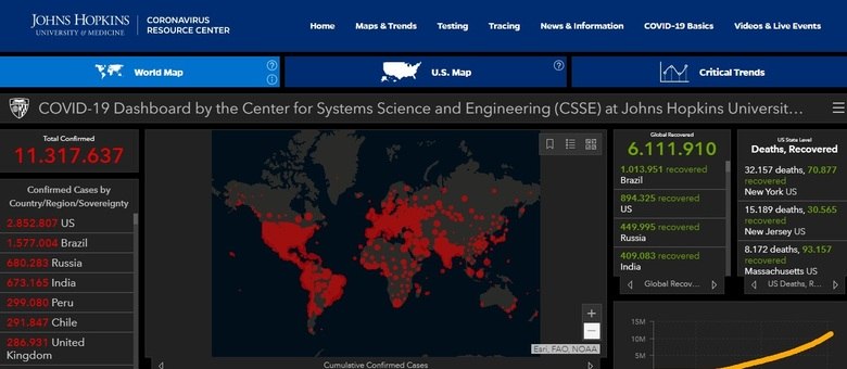 Os dados da Universidade John Hopkins são um pouco diferentes dos divulgados pelo Ministério da Saúde. Segundo o último levantamento do ministério, divulgado neste sábado, o Brasil tem 1.577.004 casos confirmados, 876.359 recuperados e 64.265 óbitos.