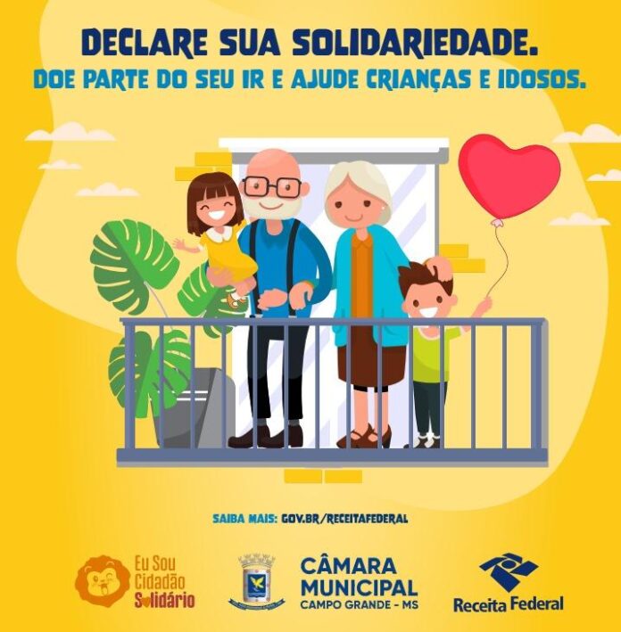 A Câmara Municipal de Campo Grande é parceira da campanha “Eu Sou Cidadão Solidário”, iniciativa da Receita Federal que incentiva contribuintes a destinarem parte do Imposto de Renda para fundos que financiam ações voltadas a crianças, adolescentes e pessoas idosas. A mobilização ocorre durante o período de declaração do imposto, que segue até o dia 29 de maio.