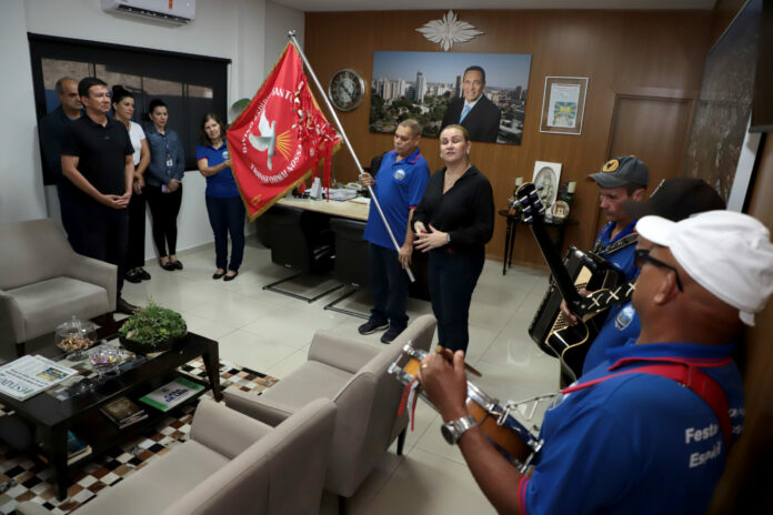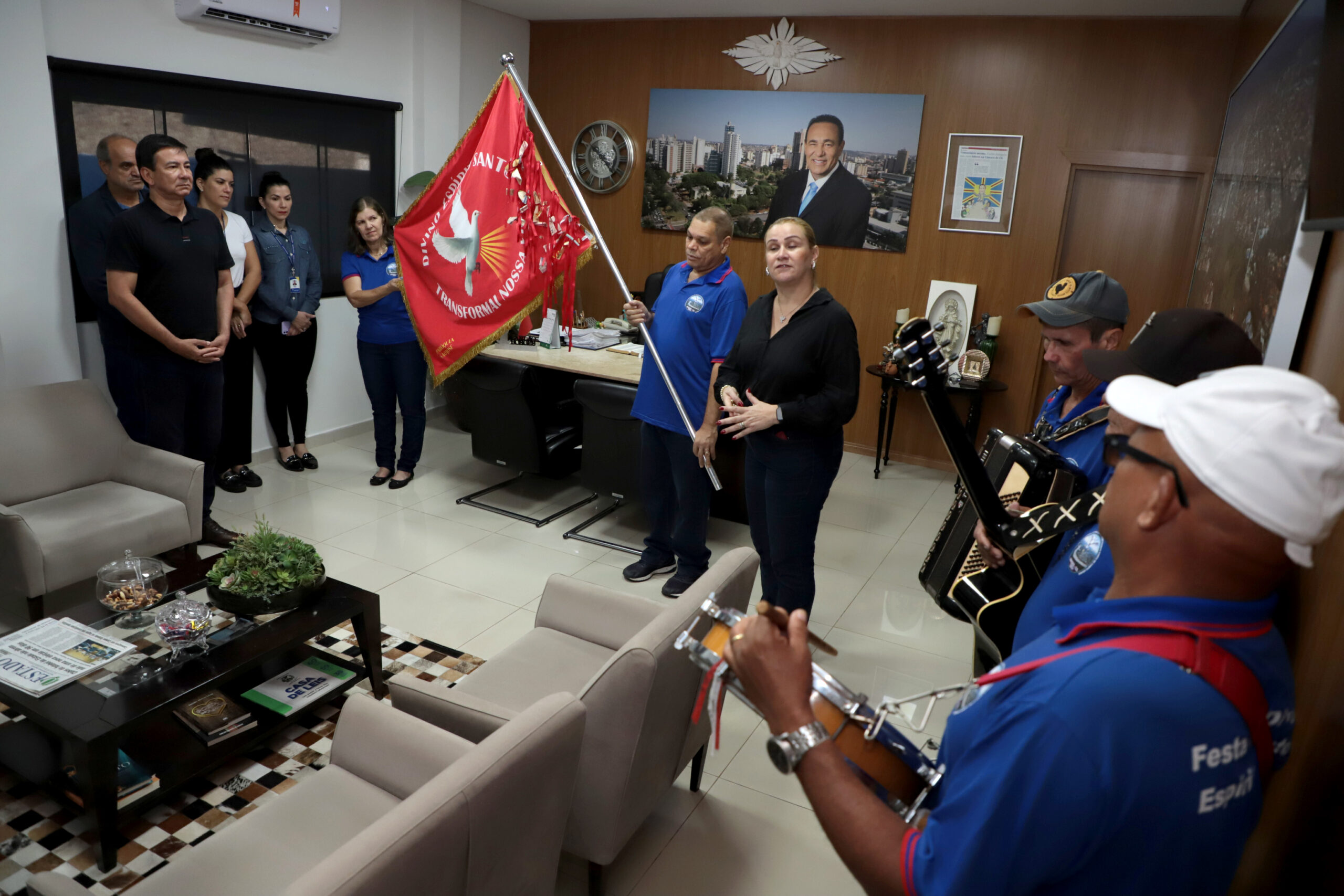 A Câmara de Vereadores de Campo Grande recebeu, na manhã desta quarta-feira (5), a bandeira do Divino Espírito Santo, símbolo de festa tradicional que ocorre há 129 anos na cidade de Coxim e que está na 27ª edição na Capital. Representantes da Associação e músicos estiveram na presidência da Casa de Leis, nos gabinetes e percorreram setores administrativos, levando as bençãos.