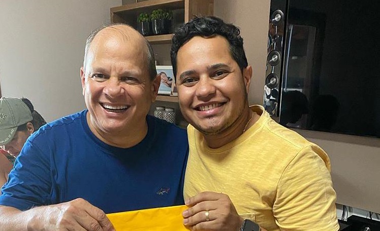 #PraCegoVer Fotografia. Pastor Edilson, de camiseta azul escura está abraçado ao filho, o vereador Papy, que está de camiseta amarela. Sorrindo, os dois se abraçam e seguram nas mãos, em frente ao corpo, um envelope laranja. Ao fundo uma televisão e uma estante de madeira.