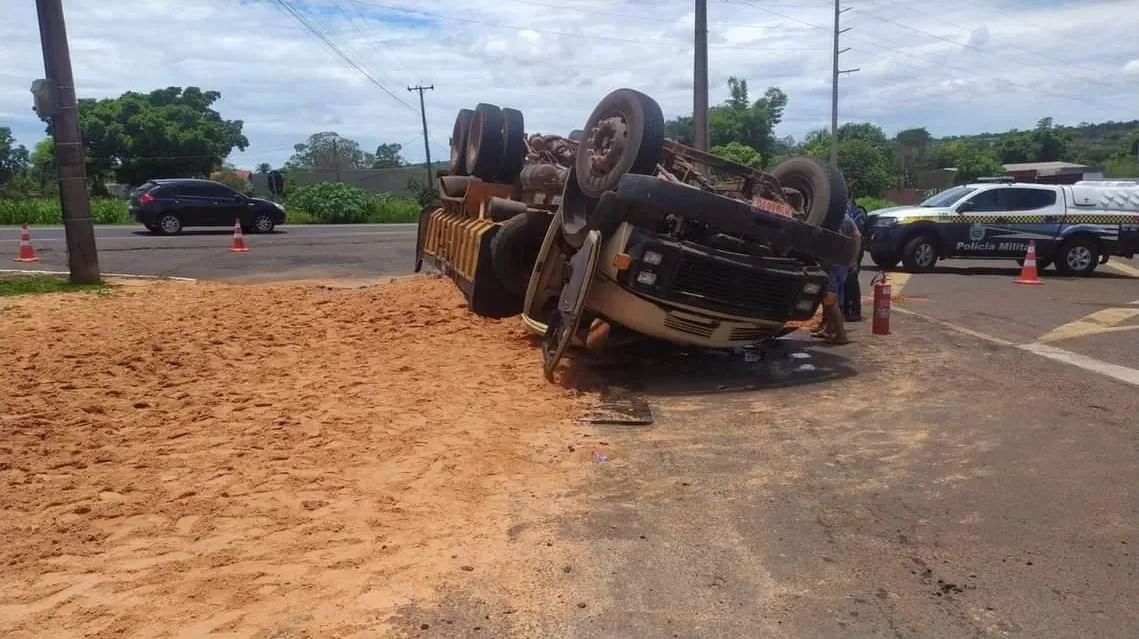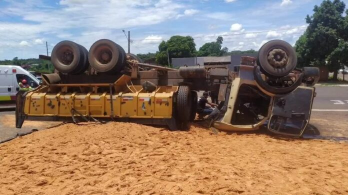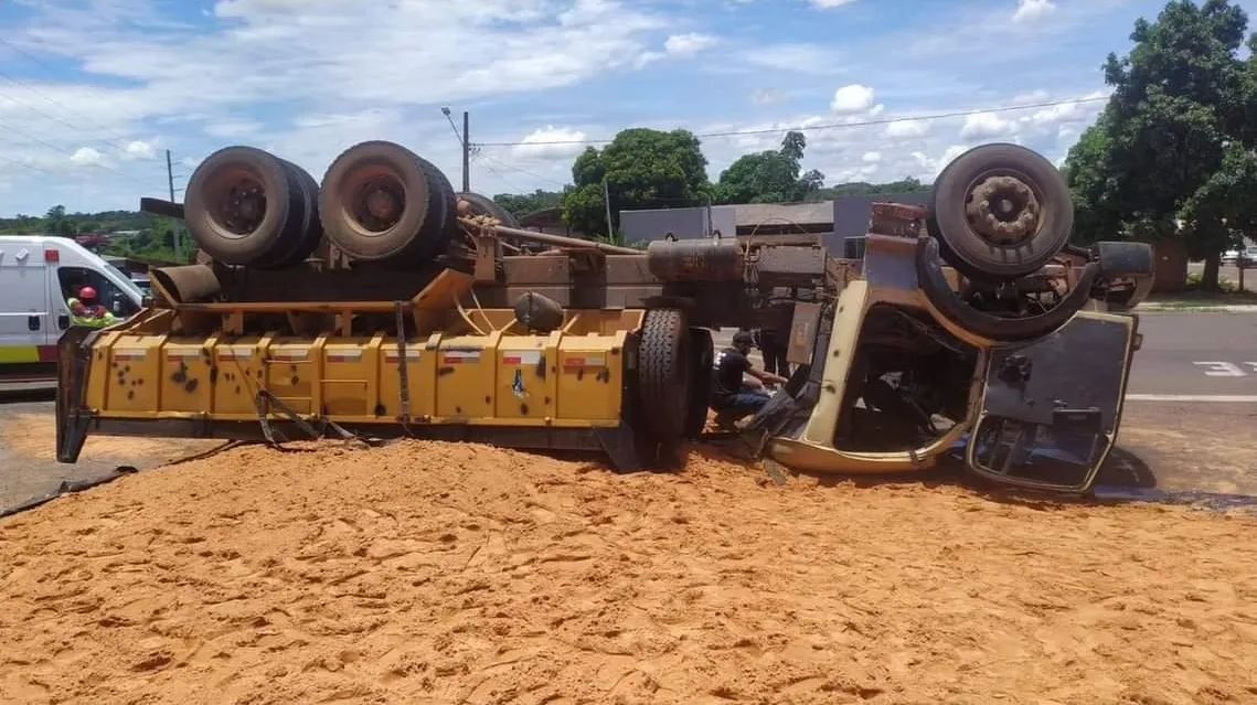 Um caminhão capotou na manhã desta terça-feira (17) no macroanel rodoviário de Campo Grande, no trecho da rodovia federal BR-163 em que dá acesso à Avenida Ana Rosa Castilho Ocampo, no Jardim Montevidéu. De acordo com as informações, o veículo estava transportando uma carga de 17 toneladas de areia.