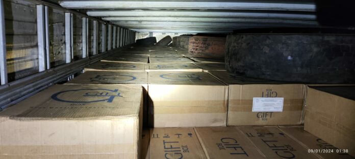Caminhão é flagrado com mais de 700 caixas de cigarros em carga de pneus usados
