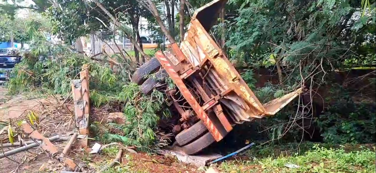 Um caminhão caçamba foi parar dentro de um córrego no centro de Campo Grande na tarde desta segunda-feira (19). De acordo com as informações, o veículo teria ficado sem os freios e o motorista responsável, de 45 anos, optou por jogá-lo dentro do córrego para evitar um acidente mais grave em um cruzamento movimentado na quadra de cima.