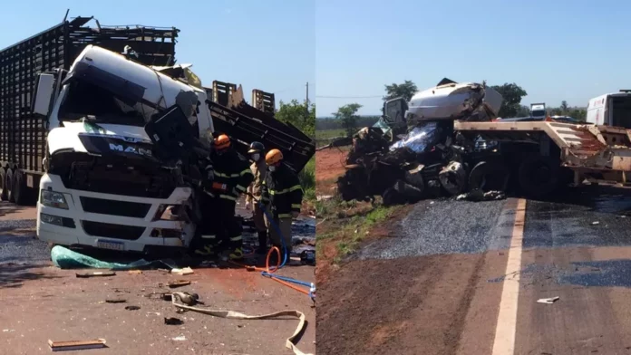 Uma carreta que transportava um trator colidiu de frente contra uma carreta boiadeira. A traseira de uma terceira carreta também foi atingida.