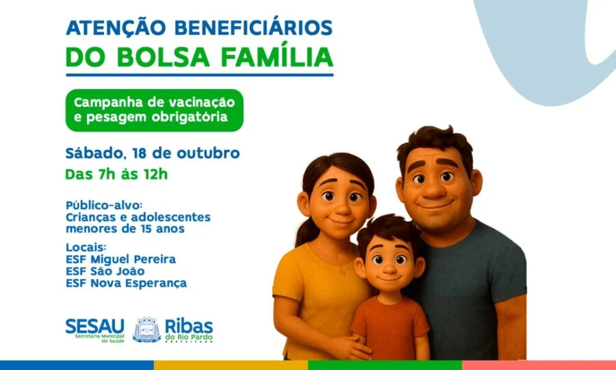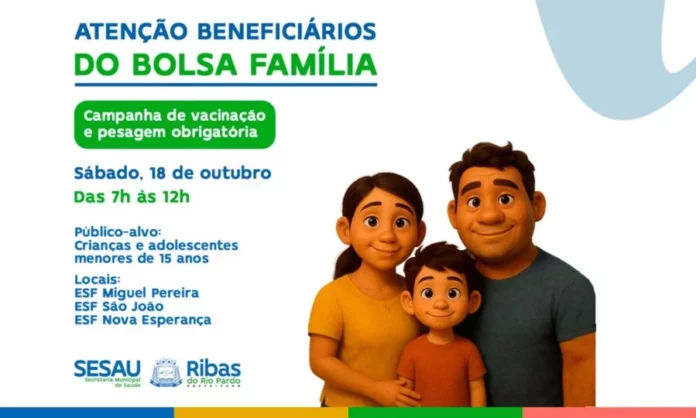 A Prefeitura de Ribas do Rio Pardo, por meio da Secretaria Municipal de Saúde, realizará no sábado, 18 de outubro, a campanha de vacinação e pesagem obrigatória para beneficiários do Programa Bolsa Família.