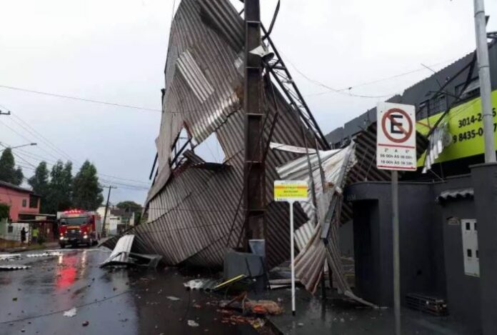 A cobertura metálica de estabelecimento comercial de pet shop na Avenida Tamandaré foi arrancada pela força de uma rajada de vento, que chegaram a 44km/h.
