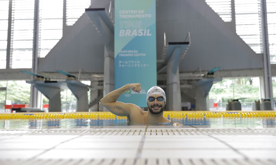 14.07.2021 - Jogos Olímpicos Tóquio 2020 - Natação masculina. O atleta Leonardo de Deus no primeiro treino da natação após chegada em Sagamihara, uma das bases do Time Brasil no Japão.