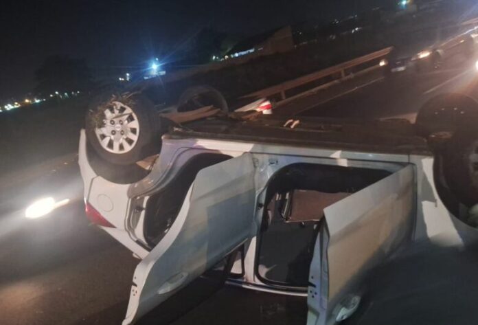 Um veículo, modelo Ford Ka, ficou destruído na noite de sexta-feira (20) ao capotar na rodovia federal BR-163, em Dourados.