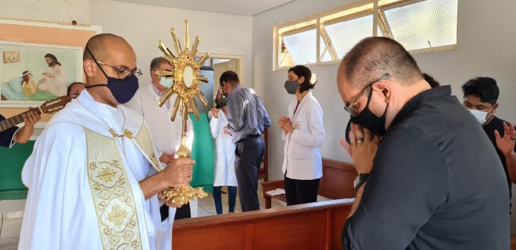 A capela do HU (Hospital Universitário) Maria Aparecida Pedrossian (Humap-UFMS Ebserh), retomou nesta quarta-feira (20), as celebrações religiosas presenciais no local. O HU recebeu na tarde de ontem, a primeira missa após a suspensão das atividades em função da pandemia. Após a celebração, o padre visitou as dependências do hospital com o Santíssimo Sacramento. Todos os presentes puderam receber a benção e fazer uma breve adoração.