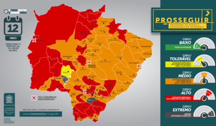 O Prosseguir, Programa de Saúde e Segurança na Economia, atualizou nesta quarta-feira o mapa situacional dos 79 municípios de Mato Grosso do Sul referente a 18° semana epidemiológica e com vigência para o período de 13 a 26 de maio.