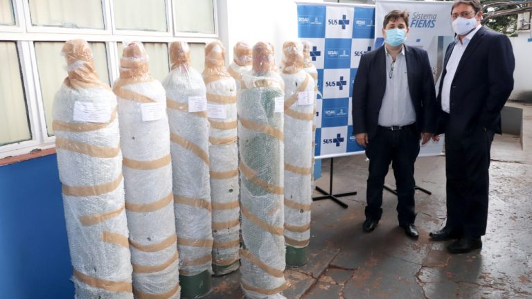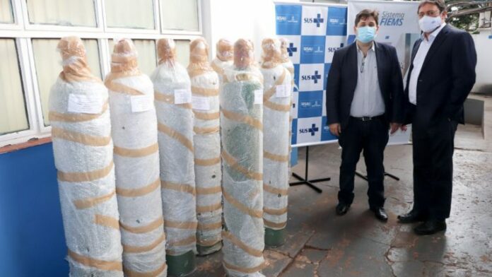 A Prefeitura de Campo Grande, por meio da Secretaria Municipal de Saúde (Sesau), recebeu a doação de 10 cilindros de alta pressão para oxigênio medicinal de 50 litros e três capacetes de respiração assistida, popularmente conhecido como Elmo, que serão destinados às unidades de urgência e emergência. A assinatura do termo de doação e a entrega dos materiais ocorreu na tarde desta quinta-feira (17) em ato com a presença do presidente da Federação das Industrias de Mato Grosso do Sul (Fiems), Sergio Longen.