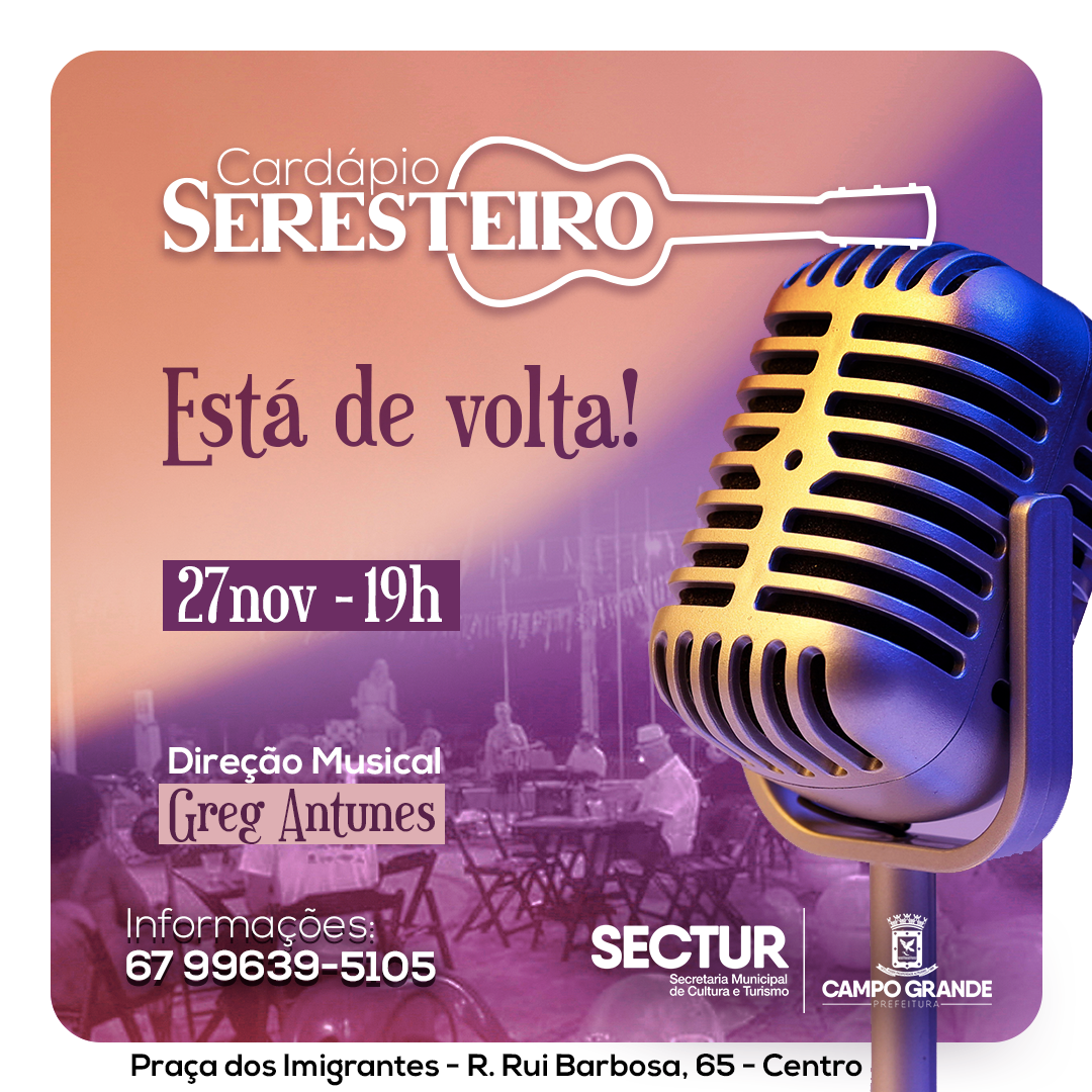 A Prefeitura Municipal, por meio da Secretaria Municipal de Cultura e Turismo (Sectur), promove a primeira edição do Cardápio Seresteiro 2020 em um novo formato: com mesas dispostas para o público, limitação de capacidade de pessoas e respeito das normas de biossegurança. O evento acontece nesta sexta-feira, 27, às 19h, na Praça dos Imigrantes, com entrada gratuita.