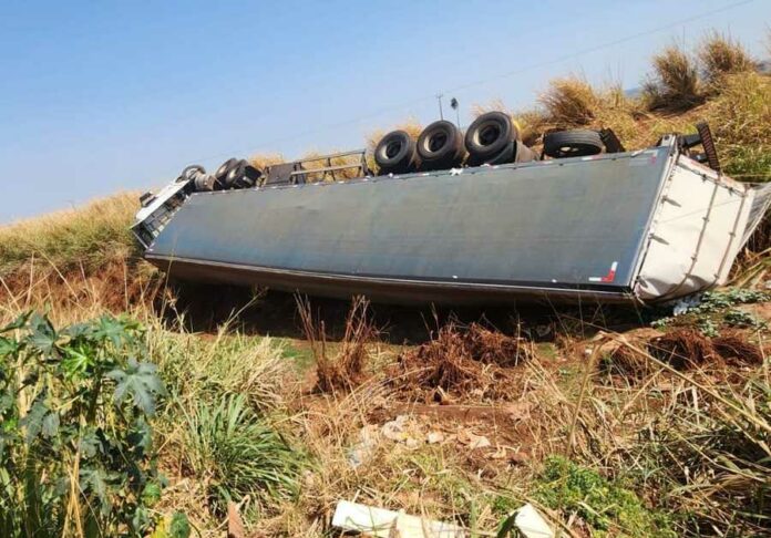 A carreta tem o semi-reboque baú e estava carregada de algodão. Após o acidente, parou com as rodas para cima na altura do Aeroporto Municipal de Nova Andradina.