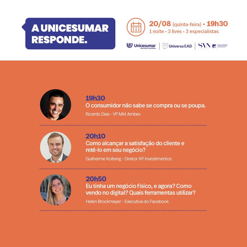 Muitas são as dúvidas sobre carreira e negócios nos dias atuais. São perguntas que parecem não ter respostas com todas as transformações vividas do dia para a noite. Como atrair e reter o meu cliente durante a crise? Como eu vendo no digital? Que ferramentas utilizo? Soluções para essas e outras perguntas serão respondidas no evento “Unicesumar Responde”, que acontecerá no dia 20/08, às 19:30, com transmissão ao vivo pelo YouTube. A inscrição deve ser feita no site oficial do evento, Acesse: https://conteudo.universoead.com.br/pt-br/evento-com-especialista