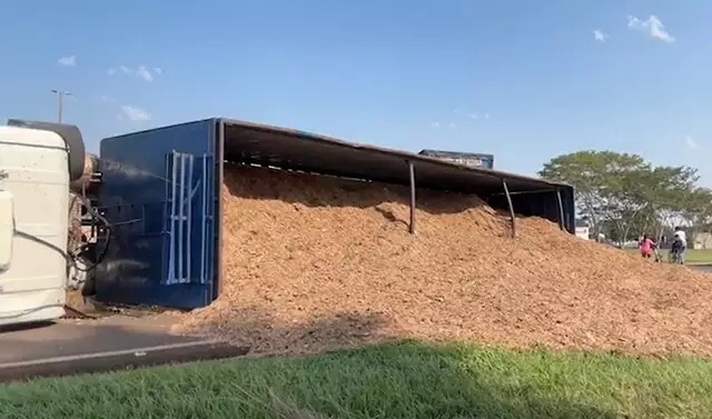 Uma carreta bitrem carregada de resíduos de eucalipto tombou nessa sexta-feira (25) na rodovia federal BR-163, no trecho próximo a cidade de Nova Alvorada do Sul.