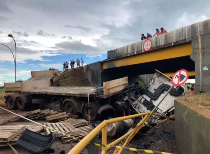 Uma carreta caiu de um viaduto sobre a BR-267, na tarde deste sábado (18) em Maracaju. Motorista, de 56 anos, foi socorrido com suspeita de fraturas e com escoriações.